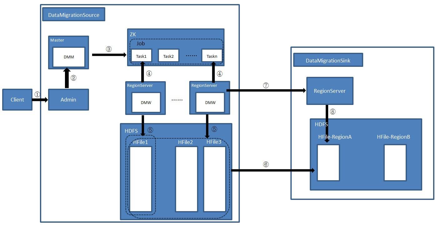 • DataMigrationManager:DMM,运行于HBase Master,负责接收复制作业、切割作业为多个子任务、派发子任务、监听完成情况等。