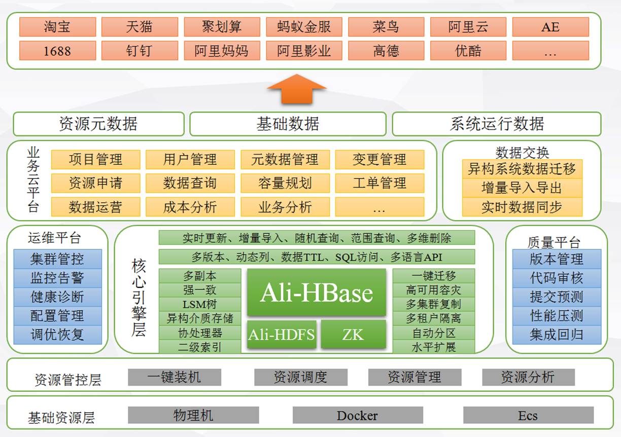 Ali-HBase作为阿里巴巴技术大厦的基础存储设施,全面服务于淘宝、天猫、蚂蚁金服、菜鸟、阿里云、高德、优酷等各个领域,满足业务对于大数据分布式存储的基本需求。