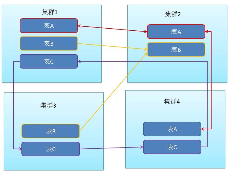 当一个HBase集群启用多个数据链路后,我们期望自由设置表的数据可以被复制到其中的一个或多个链路,使得整个数据的流动更加灵活。为此,我们增加了一种特性,通过设置表的属性,以决定该表的数据流向哪些链路,使得整个数据流动图可以由业务架构师任意设计,十分灵活。此外,当需要在集群间热迁移数据时,它也能带来十分重大的作用。 整体效果如下,以表为单位数据可以任意流动: