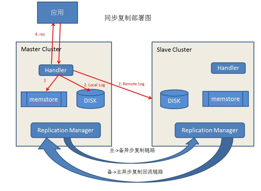 第二种,数据复制使用同步的方式。即当数据写入返回客户端成功后,能保证数据在主备集群均已写入,从而即使主集群完全不可恢复,数据在备集群中也能保证完整。