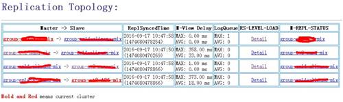 当数据可以在多个集群任意流动后,一个很迫切的需求是链路拓扑以及复制状况的可视。为此,我们强化了Replication的信息层,不仅源端保留它到多个目标的链路信息,而且每个目标端也会保留多个源端到它的链路信息,从而我们可以从任意一个集群绘制整个链路拓扑图。同时,我们极大丰富Replication的运行状况信息,并将之汇聚到HBase的Master节点,由其统一汇总展现,从中我们可以清晰得到数据是否积压、复制的性能瓶颈、节点间的均衡情况、具体的延迟时间等信息,其中复制的延迟时间是一个十分关键的信息。基本信息如图: