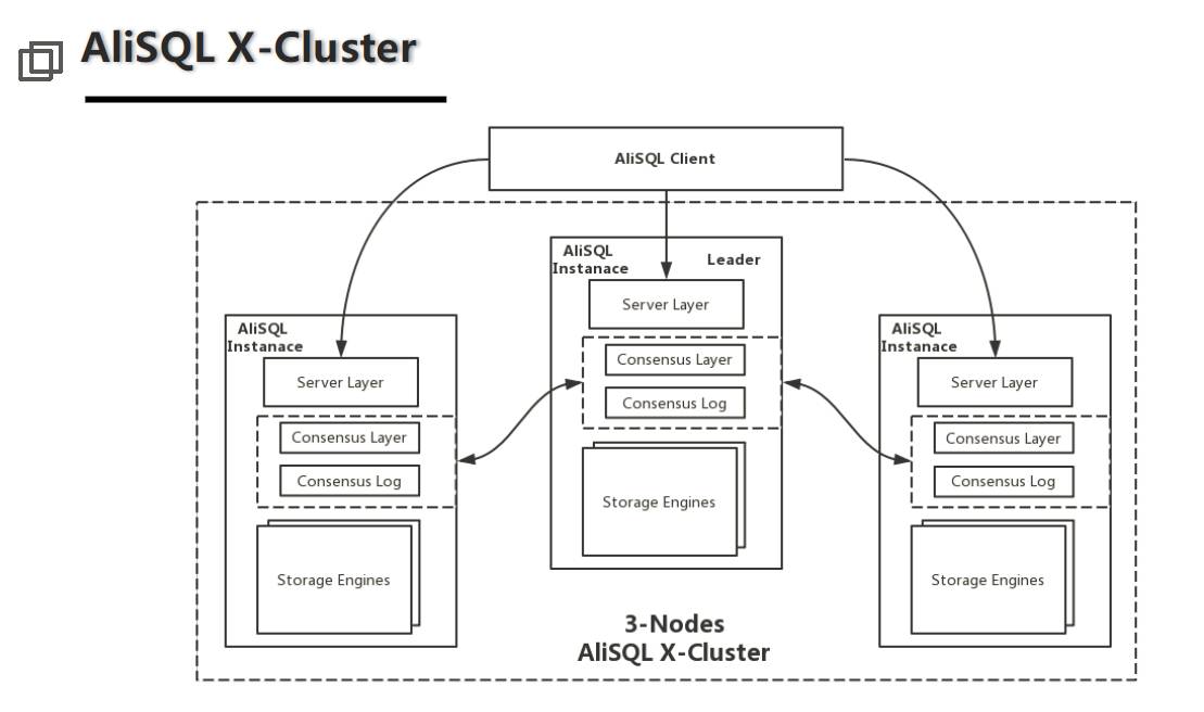 我先讲一下我们在数据库内核上的思考。首先我很尊敬做国产数据库的厂商,凡是在内核上改进的人都知道,其实每个功能都是要一行行代码写出来都是非常不容易的,我想表达对国产数据库厂商包括这些技术人的尊敬。今天我要讲的内容是我第一次在国内的会议上来讲,首先我会讲一下AliSQL X-Cluster。X-Cluster是在AliSQL上做的一个三节点集群,这是我们在引入了Paxos一致性协议,保证MySQL变成一个集群,并且这个集群具有数据强一致、面向异地部署,且能够容忍网络高延迟等一系列特性。