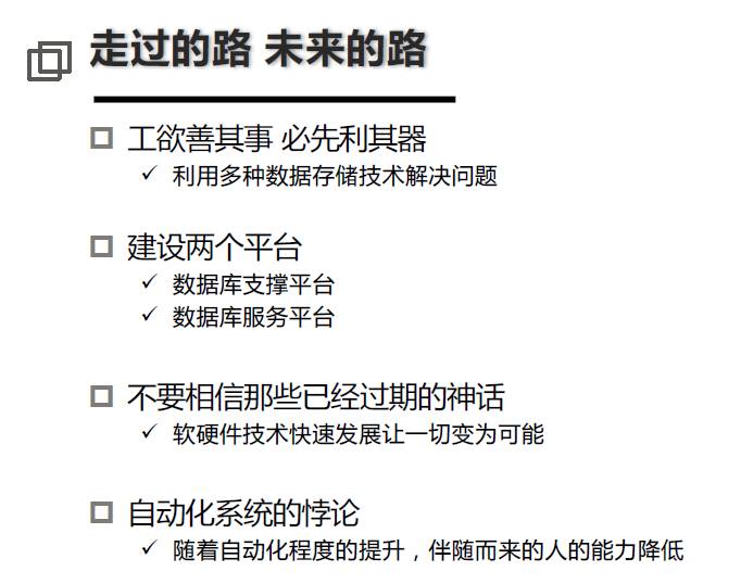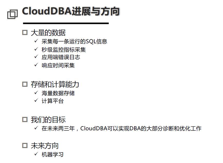 但是最难解决的就是刚才我说的诊断和优化。我也了解过很多公司,比如说Google、facebook,我说你们为什么没有DBA呢?他们说我们没有DBA,没有像国内这种特别传统的针对诊断和性能优化的DBA,这种职责很少。所以这个东西希望能够做到。