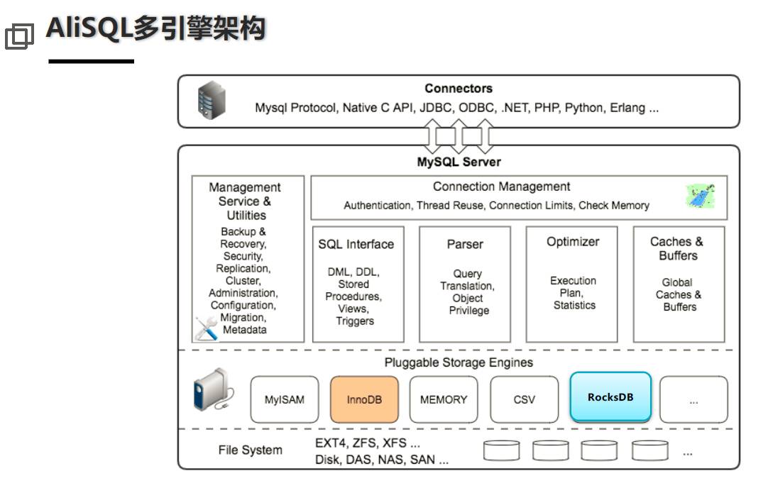 比如我们现在选择RocksDB,这是因为我们和Facebook在RocksDB上有一些合作,就是把它引入到MySQL上面,它本质的结构是LSM Tree,这个结构就带来的好处包括写入比较友好、压缩的特性好等。把它引入进来对我们的改革还不仅仅是引入了一个结构,而是今天我们用这两种引擎解决我们今天数据分离的问题。我们也跟Facebook有过一些交流,RocksDB今天并没有那么稳定、那么好,但是作为InnoDB存储引擎的补充的话,是非常有效的。