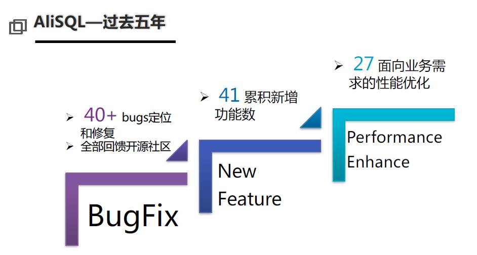 首先说一下,阿里巴巴最早一代使用的数据库技术是Oracle,后面大家也知道一件事情就是去IOE,去IOE过程中我们迈向了使用开源数据库的时代,这个时代今天已经过去,这个过程大概持续了五六年,整个阿里巴巴有一个大家都知道的开源MYSQL分支–AliSQL,我们在上面做了大量的改进,所以我这里列了一下在AliSQL上的一些改进,但今天我实际上并不想讲这个,我想讲一下面向未来的下一代数据库技术、数据库架构会往哪个方向走。