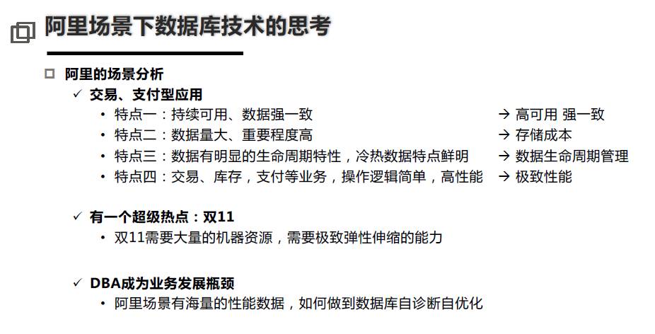 可以看到其实阿里巴巴的应用和Facebook、Google的还是有很大区别的,我们也找他们做了交流,发现跟他们的业务场景真的不一样,首先我们的主要应用是交易型的,这些应用会有些什么要求,你会看到有这些点(见图片),下面主要讲一下我们的思考。