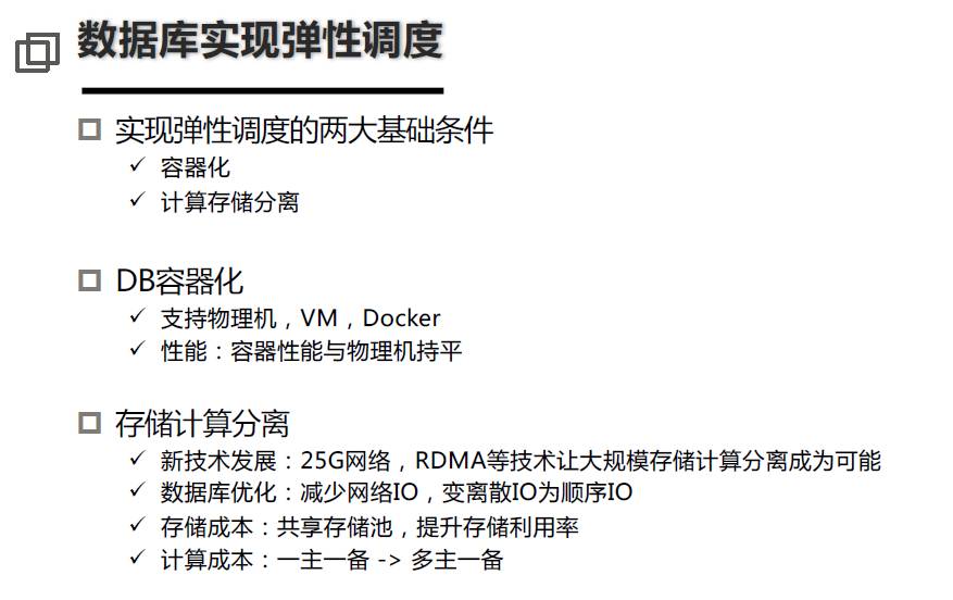 我之前听好多人说数据库容器化是个伪命题,为什么要做容器化,为什么要把数据库放到容器里呢?第二也有一些新技术,比如刚才的分享嘉宾也提到的,把存储放在远端通过网络访问是可能的。但是我们从正向来思考,先别想数据库弹性调度可能不可能,数据库如果要实现弹性调度,它的前提是什么?
