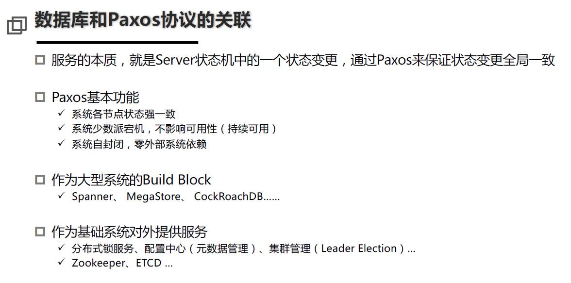 今天很多数据库都会和Paxos联系在一起,比如大家都知道的Google的Spanser数据库,但是以前大家没有特别想过数据库和Paxos会有什么关系,其实以前确实没有什么关系的,但是今天的数据库在几个地方是需要用到Paxos协议的,第一个我们需要用Paxos来选举,尤其在高可用的场景下需要唯一地选举出一个节点作为主节点,这就需要用到Paxos;第二是用Paxos协议来保证数据库在没有共享存储的前提下数据的强一致,就是数据怎么样在多个节点间保证是强一致,且保证高可用。
