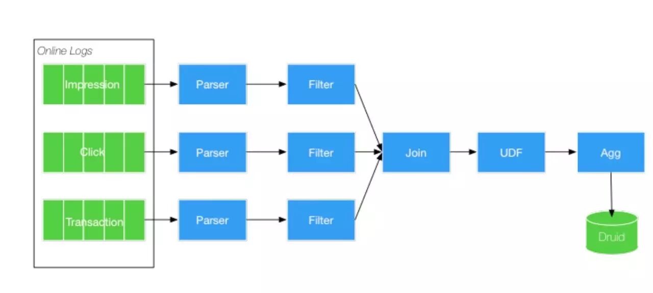A/B Test的目标就是通过实时数据分析和统计反馈,不断调整在线系统的算法模型,自动适应到最佳效果, A/B Test数据收集和处理流程大致如下图所示,Blink任务从线上日志实时同步用户行为数据,然后解析、过滤、统计,最终将各项统计指标写入OLAP系统中,让算法或者运营人员可以实时看到线上实际效果,从而合理调整配置各种模型,逐步达到最佳效果。