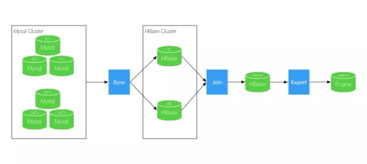 淘宝的搜索引擎是用户在淘宝购物的最主要入口,淘宝的商品数据处理和索引构建流程大致如下图所示,淘宝的商品库都存储的阿里巴巴的MySQL集群中,搜索的数据处理流程需要从MySQL将数据同步到搜索引擎后台的HBase存储中(类似:Google都将网页抓取到BigTable中),然后进行各种业务逻辑处理和索引构建,最终将索引推送到在线搜索引擎中提供搜索服务。