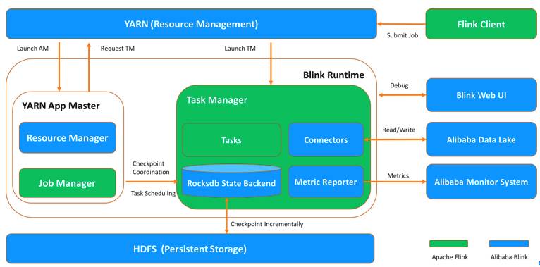 Blink实时计算引擎在阿里巴巴内部是运行在Hadoop集群上的,Blink计算任务会根据自己的需求向YARN申请计算资源,运行过程中周期性将计算状态持久化到HDFS上,以方便随时恢复,因此可以看出新型的Blink计算平台也可以很好的leverage成熟的Hadoop生态。