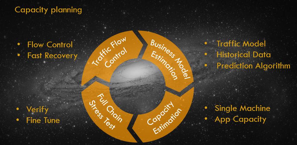 在双11等大促场景的准备过程当中,容量规划一般分为四个阶段: