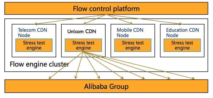 对于系统调用量比较大的场景,我们有更好的处理办法。其中的一种做法我们称为请求的引流转发,阿里巴巴的系统基本上都是分布式的,通过将多台机器的请求转发到一台机器上,让一台机器承受更大的流量,从而达到压力测试的目的。