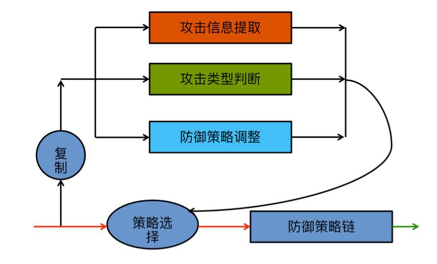 图4是一个基本的智能化防御的模型,核心的逻辑从上到下基本上分成三个角色:通过分析攻击信息,判断攻击类型,对防御策略做实时的调整,保证清洗效果的同时,减少了大量的人力投入,实现了真正的自动化,智能化防御。
