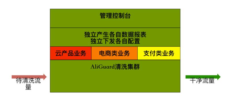 最开始AliGuard只是为了集团防护针对电商或者支付类业务所设计的一套非常定制化的DDoS攻击清洗解决方案,使用了一套相对比较固定的防御策略模板。但是后面随着阿里巴巴集团业务的高速发展,越来越多的业务线出现大流量DDoS防护需求,特别是云计算领域的快速崛起,一线的客户直接就面临攻击防御需求,那么变革随之而来,这使得我们扩展自身的产品架构、同时支持多用户变得理所当然。