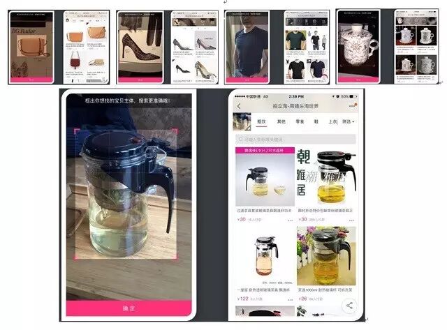 我们来看几个例子。这是同一个包,但其实图像是不一样;这是一只鞋子,虽然我们没有找到同款,但找到了非常相像的款式;这是一件圆领衫,没有什么显著的特征,比较难做,但也是找到了很像的衣服;这个杯子是一次开会的时候看到的,你要用文字搜就说不清楚了,但用图像找到同款却易如反掌。