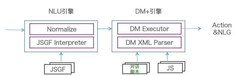 第三,我们设计了对话面向开发者的方案,称之为Open Dialog,背后有一个语言理解引擎和一个对话引擎。面向开发者的语言理解引擎是基于规则办法,能够比较好的解决冷启动的问题,开发者只需要写语言理解的Grammar、基于对话描述语言开发一个对话过程,并且还有对数据的处理操作。这样,一个基本的人机对话就可以完成了。