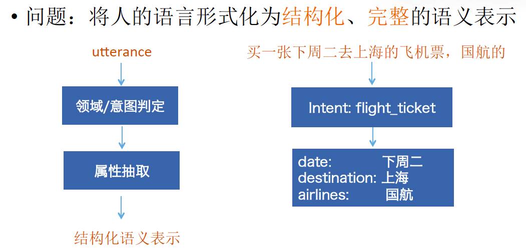 语言理解简单来说就是把用户说的话,转换为一种结构化的语义表示,从方法上会分成两个模块:用户意图的判定和属性的结构化抽取。来看一个例子,比如用户说,我要买一张下周去上海的飞机票,国航的。第一个模块要理解用户的意图是要买飞机票,第二,使用抽取模块,要把这些关键的信息出处理出来,出发时间、目的地、航空公司,从而得到一个比较完整的结构化的表示。