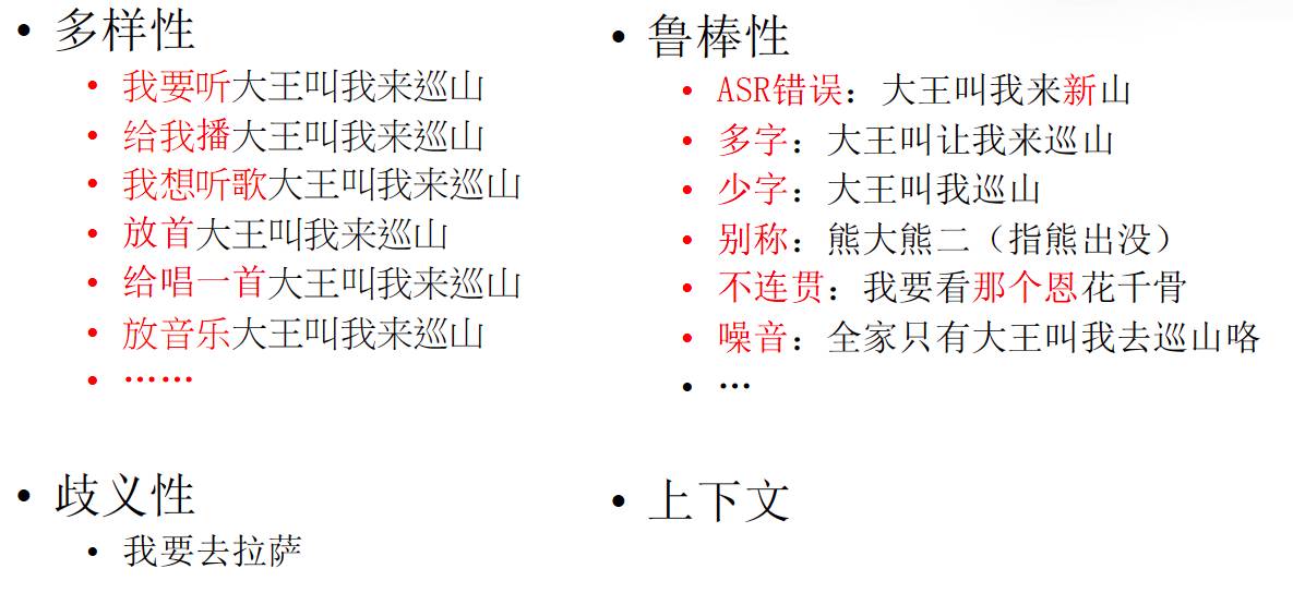 第一,表达的多样性。同样一个意图,比如用户说,我要听《大王叫我来巡山》,但是,不同的用户有太多太多不同的表达方式,我要听歌,给我放一首音乐等等。那对于机器来说,虽然表达方式不一样,但是意图是一样的,机器要能够理解这件事情。