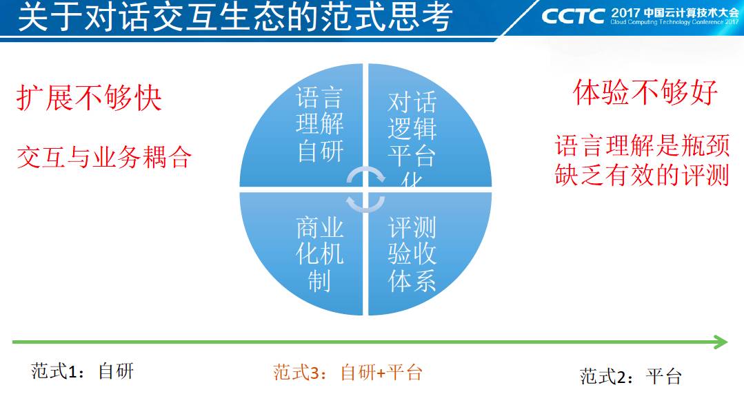 第二,对话逻辑要平台化。对于对话交互因为它和业务比较紧,每个业务方有自己特殊的逻辑,通过平台化比较合适,让平台上的开发者针对各自场景的需求和交互过程来开发对话;