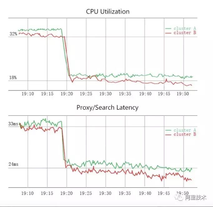 在离线验证了算法效果后,我们在双11前夕对算法进行了上线,以期望降低引擎的计算压力。上线期间的引擎CPU使用率以及平均搜索latency变化如下图:可以看到CPU使用率从32%下降到18%;而平均的搜索latency从33ms下降到24ms,图中有2条曲线分别表示引擎的2个集群。需要注意的是,在引擎压力大量下降的情况下,线上的排序指标,包括CTR和GMV是略上升的。