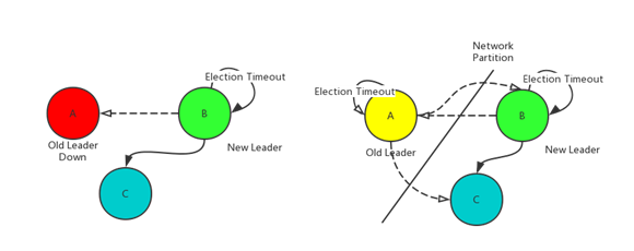 如上图所示,一个三节点的X-Cluster集群,左边的Case是原Leader A节点宕机,因此B节点和C节点会在较长的时间内收不到Leader的心跳,因此在一个选举超时周期后,B节点开始尝试推选自己为Leader,并且C节点同意,那么B成为新的主节点,恢复服务能力。