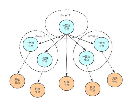 如上图所示,X-Cluster集群中的只读节点可以从任何一个一致性节点复制日志,这不仅是考虑到如果所有节点的日志都从Leader节点复制会对Leader节点造成过大的网络和IO瓶颈,而且由于跨区域部署下不同地域的数据状态机可能会有延时,设置了读写分离的用户在特定的场景下需要有特定的只读状态延时的要求。但是这时的问题就是如果某个一致性节点发生了宕机,那么和它建立复制关系的只读节点应该如何进行灾备联动?