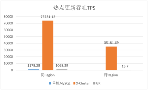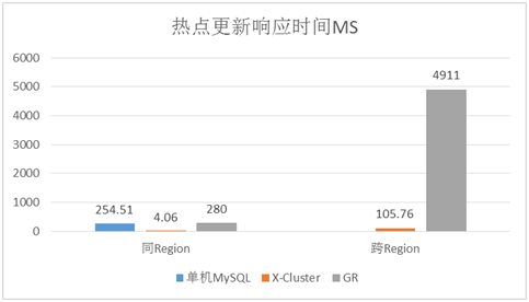 热点更新是X-Cluster的一大亮点功能,根据测试结果,无论是同域还是跨域部署, X-Cluster的吞吐和响应时间表现都要远远超过单机MySQL和GroupReplication。