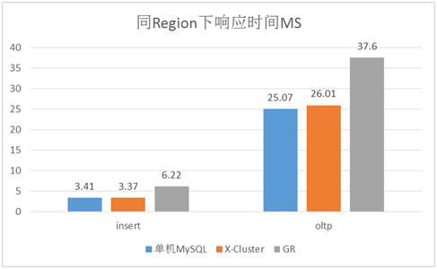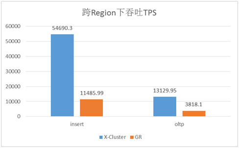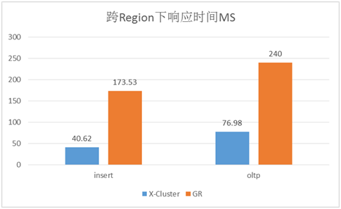 在同一个域下,X-Cluster的吞吐和响应时间表现都是非常出色的,甚至略好于单机版本的MySQL 5.7.19。相比Group Replication,在本次测试的压力下,Insert case X-Cluster有超过一倍的吞吐以及55%左右的响应时间,OLTP case X-Cluster 有超过5%的吞吐以及接近70%的响应时间表现。
