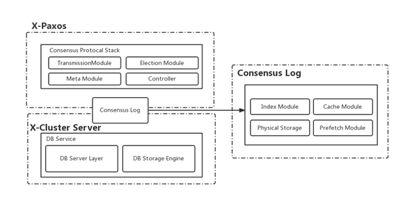 X-Cluster 的每个实例都是一个单进程的系统,X-Paxos被深度整合到了数据库内核之中,替换了原有的复制模块。集群节点之间的增量数据同步完全是通过X-Paxos来自驱动,如何复制,从哪个点回放不再需要运维人员或者外部工具来介入。 X-Cluster为了追求最高的性能,利用MySQL的Binlog进行深度改造和定制来作为X-Paxos的Consensus日志,实现了一系列的X-Paxos日志接口,赋予X-Paxos直接操纵MySQL日志的能力。