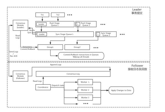 Follower节点也使用X-Paxos进行日志的管理操作,为提升接收效率,收到Leader传递过来的日志以后将日志内容Append到Consensus Log末尾,Leader会异步的将达成多数派的日志的消息发送给Follower,Follower的协调者线程会负责读取达成多数派的日志并加以解析,并传递给各个回放工作线程进行并发的数据更新。 Follower的并发回放可以有多种方式,包括按照Leader上的Group Commit维度或者是按照表级别的维度,未来会引入最新的writeset方式来精确控制最大并发。