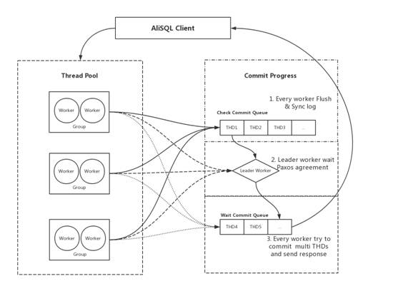 传统的MySQL都是 One Thread per Connection的工作模式,在引入线程池后是以一个线程池孵化一定数量的工作线程,每个线程负责处理一次query的解析、优化、修改数据、提交、回网络包等等。集群需要跨地域部署下,一次事务的提交由于需要在集群之间同步事务日志,受限于网络的RTT的限制,会达到数十毫秒的级别,那么对于一个普通的写事务来说,大量的时间会耗费在同步节点日志等待事务提交的过程。