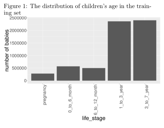 根据我们的行业认知,一个孩子的生命阶段发展是一个与年龄密切相关的连续过程。因此我们将母婴用户的生命阶段根据孩子的年龄分为以下几个阶段:出生前(妈妈的孕期);0-6个月(新生儿);6-1个月;2-3岁(托儿所);3-7岁(幼儿园)。不同年龄段孩子的父母会对不同的商品感兴趣,如果我们可以准确预测他们孩子的年龄段并推荐合适的商品,就可以大幅提高转化率。