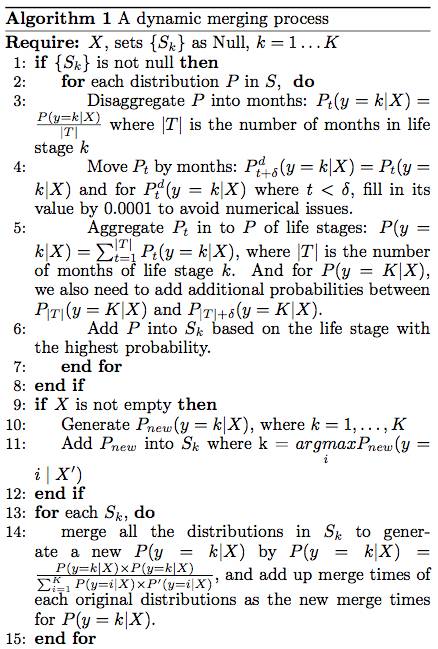为了推断一个孩子的生命阶段,我们开发了一种不断预测并且不断改进推论的算法。与使用复杂模型进行一次性预测的方法不同,我们的算法每次会根据当前的数据产生一个较好的预测结果,然后不断地更新我们的推论,这就是所谓的动态融合过程。下面将会具体介绍动态融合过程的细节。