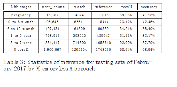 实验的月份越多,关于生命阶段的结论会因为越来越多的消费者行为被隐性地考虑在模型中而变得越稳定。这个方法的另外一个优势在于,对于任何一个错误的推断可以在接下来的月份中得到修正。这一点可以被实验中2016年11月、12月,2017年的1月和2月份的结果说明。11月份中错误的结论在接下来的月份中被逐渐修正。读者会质疑正确的结论也可能被改为错误的结论,但是我们的实验表明总体上,动态融合方法不会差于无记忆方法。