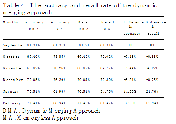 表2,3,4展示了从2016年9月份到2017年2月份的实验结果。值得注意的是因为2016年9月份作为起始点,所以两种方法的结果是一样的。正如表2和表3所展示的,基于动态融合的方法几乎比无记忆方法好10%。表4展示了不同月份的比较结果。5个月(2016年9月份不包含在比较结果中)中有2个月动态融合方法在准确度显著超越了无记忆方法(最高达15%),在另外的3个月中无记忆方法比动态融合方法预测的更准确(不超过10%)。动态融合方法在召回率上超越了无记忆方法。5个月中,动态融合方法在3个月中超越了无记忆方法,最高记录高达21.76%,而在另外2个月中只比无记忆方法稍微逊色,最坏记录不超过-1%。