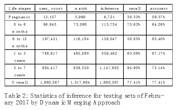 我们使用多元逻辑回归模型对婴儿的生命阶段进行分类预测、产生相应的概率分布。此外我们还开发了动态融合方法以不断提高预测精度,并且可以有效地提高计算效率。每次有新的概率分布生成后,我们会更新然后维护多个概率分布。这样做可以识别消费者的短期兴趣,而且对于多个孩子的生命阶段预测也是非常有帮助的。