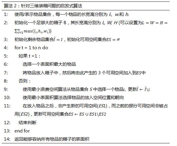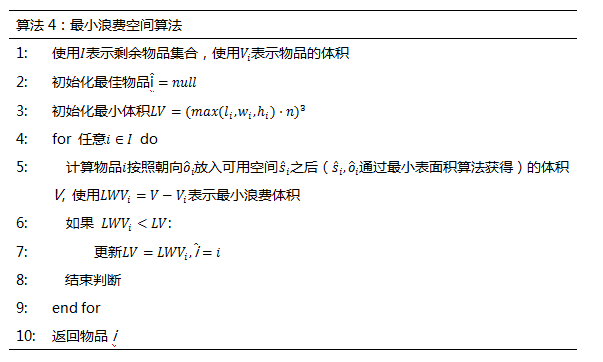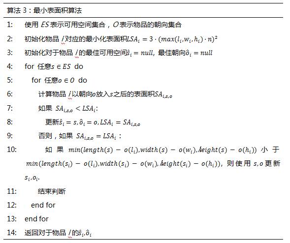 用于求解本文的新型三维装箱问题的启发式算法包括最小表面积(least surface area)算法和最小浪费空间(least wastespace)算法。算法的详细步骤如下所示:
