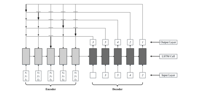 本研究主要使用了[Vinyals et al.,2015]和[Bello et al.,2016]提出的神经网络结构。在Vinyals和Bello等人的研究中提出了一种名为Pointer Net (Ptr-Net)的神经网络来求解组合优化问题。例如,在求解旅行商问题时,二维平面中每个点的坐标被输入到网络模型中,经过计算之后,模型的输出为每个点被访问的顺序。这种网络结构与[Sutskever et al.,2014]提出的序列到序列模型非常相似,但是有两点不同:第一,在序列到序列模型中,每一步的预测目标的种类是固定的,但是在Ptr-Net中是可变的;第二,在序列到序列模型中,在解码阶段通过注意机制将编码阶段的隐层单元组合成为一个上下文向量信息,而在Ptr-Net中,通过注意机制来选择(指向)输入序列中的一个来作为输出。