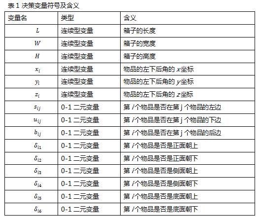 本文提出的新型装箱问题的数学表达形式如下所示。给定一系列物品的集合,每个物品i都有各自的长(li)、宽(wi)和高(hi)。优化目标为寻找一个表面积最小且能够容纳所有物品的箱子。我们规定(xi, yi,zi)表示每一个物品的左下后(left-bottom-back)角的坐标,而且(0, 0, 0)表示箱子的左下后角的坐标。决策变量的符号及其含义如表1所示。基于以上问题描述和符号定义,新问题的数学表达形式为: