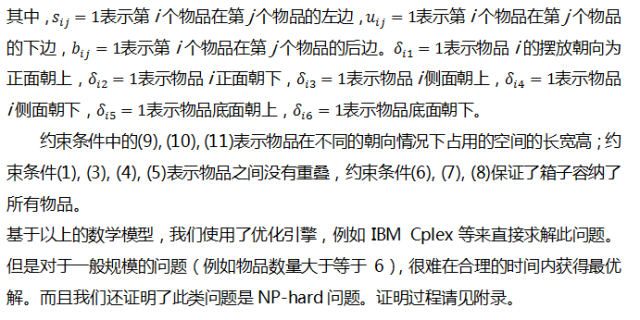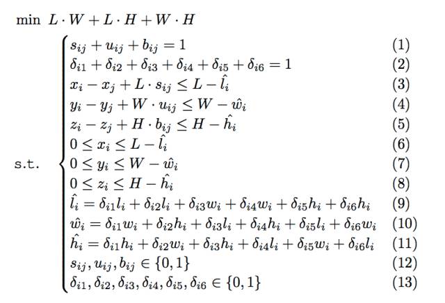 在某些实际业务场景中,我们发现装箱时并不是使用固定尺寸的箱子(例如在跨境电商业务中,大部分是使用柔性的塑料材料,而不是箱子来包装货物),而且由于装箱的成本大部分都由装箱材料成本构成,而装箱材料成本又主要取决于材料的表面积。所以在本研究中,我们提出了一类新型的装箱问题。与传统三维装箱问题不同的是,本问题的优化目标为确定一个能够容纳所有物品的箱子,并最小化此箱子的表面积。