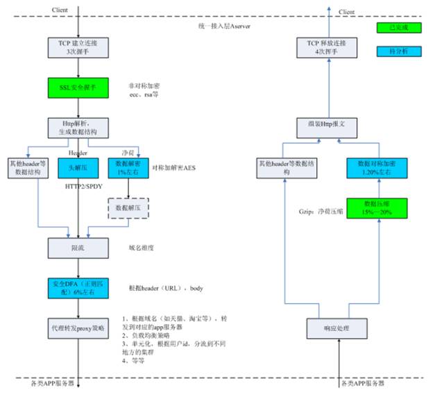主站接入层承载集团90%以上的入口流量,看似只是作为一个七层流量转发网关,但是却做了非常之多的事情,譬如https卸载及加速、单元化、智能流量转发策略、灰度分流、限流、安全防攻击、流量镜像、链路追踪、页面打点等等,这一系列功能的背后是Tengine众多模块的支持。由于功能点比较多,所以这就导致Tengine的CPU消耗比较分散,其主流程处理如下图所示: