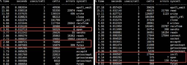 - b. 使用上述问题解决后的驱动intel-qatOOT31092,测试后发现CPU节省效果不佳(用户态CPU减少、但是增加了内核态的CPU),经分析、发现使用QAT加速后,部分系统函数CPU占比变高,如 open、ioctl、futex,如下图所示(注:左边的是使用QAT后各系统热点函数),使用QAT后open、ioctl、futex执行时间占比高达8.95(注:3.91 + 2.68 + 2.36),而未使用版本对应占比时间才0.44(注:0.24 + 0.14 + 0.06);