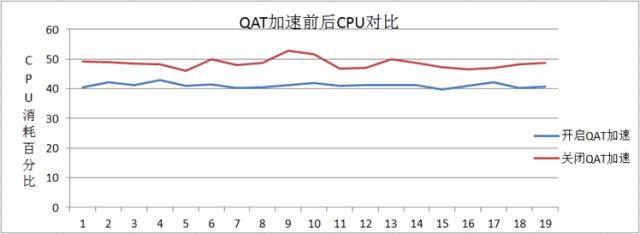 同等条件下,开启QAT加速后CPU平均值为41%左右,未开启QAT加速的CPU平均值为48%左右,如下图所示: