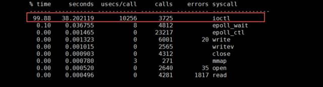 使用strace进行相关系统热点函数统计发现,其CPU主要消耗在ioctl系统函数上,如下所示: