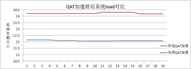 相同条件下,开启QAT加速后系统load平均值为12.09,关闭QAT加速时系统load平均值为14.22,如下图所示:
