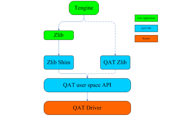 接入层Tengine目前采用的是下图左边的实线加速链路,其中Zlib Shim、QAT User Space Api、QAT Driver作为Tengine Gzip与底层硬件QAT的通信适配层,此方式对上层业务入侵较小、其软件架构如下图所示: