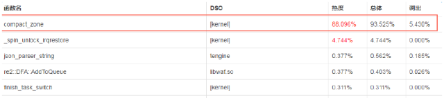 通过perf查看ioctl主要是执行内存分配命令,由于Zlib Shim需要开辟连续的物理内存、所以出现频繁调用 compact_zone进行内碎片整理,其调用热的高达88.096%,如下图所示(注:热度表示该函数该函数自身的热度、调出: 表示被调用函数的热度总和、总体: 热度 + 调出):