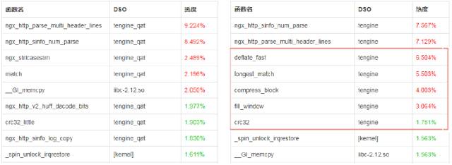 同比条件下Tengine Gzip使用QAT加速卡后,CPU消耗从48%下降到41%,系统负载load下降2个,且根据模块热点函数图对比发现Gzip基本上已经完全卸载。