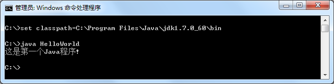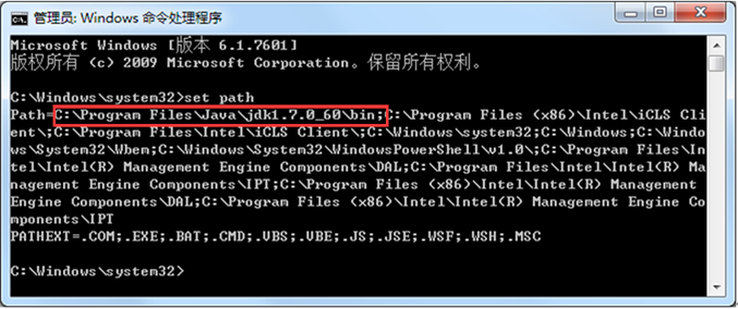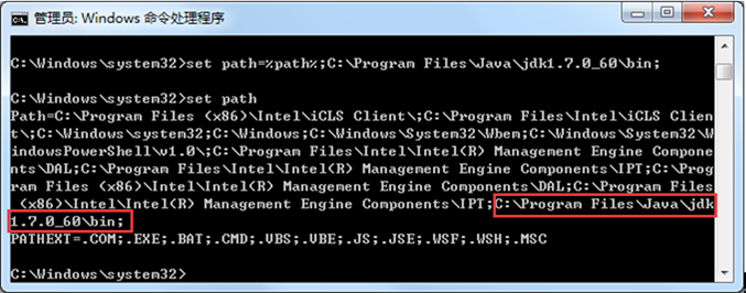 其中,“%path%”表示引用原有的path环境变量,“C:\Program Files\Java\jdk1.7.0_60\bin” 表示javac命令所在的目录。整行命令的作用就是在原有的path环境变量值中添加javac命令所在的目录。